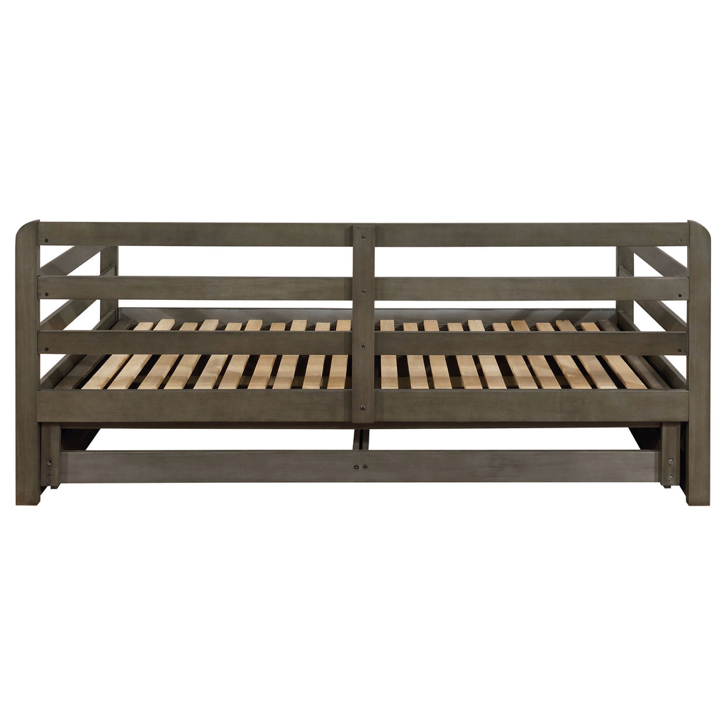 Bring function and fashion to your sleep space with this wood storage sleeper daybed. It is fashioned with pine, plywood, and MDF and is mattress-ready (no foundation required). Bed showcases storage footboard with two built-in drawers for linens and other items. You'll love the convenient fully slatted pull-out sleeper when guests stay over. It's perfect for any sleep space and is versatile enough for a tight living space like a loft, as well. Key Features: • Rustic twin XL daybed with trundle in grey finish • Trundle extends to accommodate second twin mattress (6” mattress recommended) • Trundle includes two (2) storage drawers • Pine, plywood, and MDF construction • Slat kits included