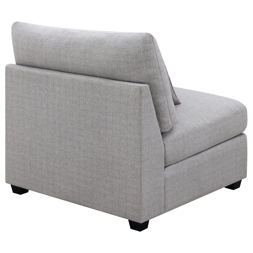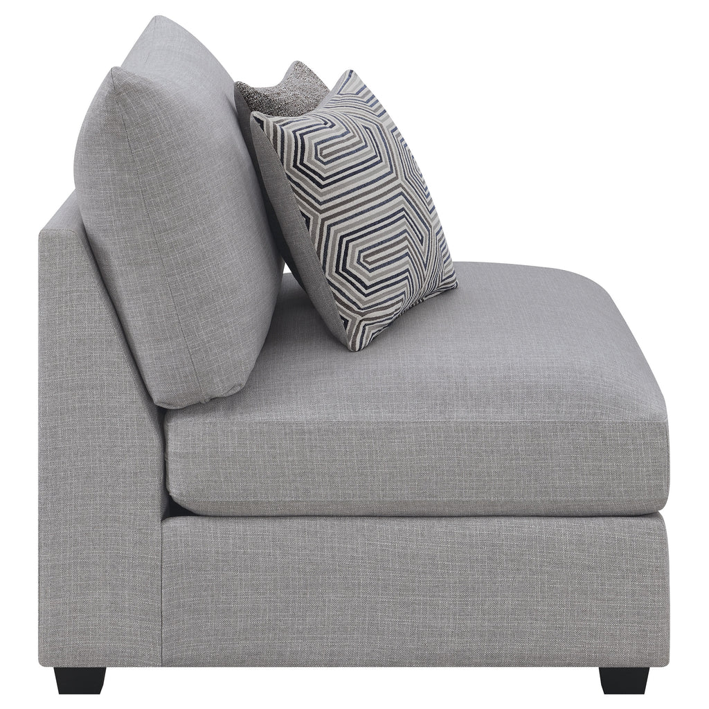 This armless chair offers versatility and modern appeal for today’s living spaces. Upholstered in soft grey fabric, its clean lines and plush cushions provide both comfort and style. Designed with a modular structure, it easily connects with matching components to form a sectional or stands alone as an accent seat. Crafted with solid wood legs, a sturdy frame, and reversible cushions wrapped in feather down, this upholstered chair delivers lasting durability and inviting comfort for any contemporary home. Key Features: • Armless chair features a modern silhouette in soft grey fabric for versatile styling • Modular design allows combination with matching components for custom layouts • Reversible seat and back cushions offer extended use and easy maintenance • Feather-down wrapping enhances plush comfort and luxurious seating feel • Crafted with solid wood legs and sturdy frame for lasting structural integrity • Ideal as a standalone accent seat or sectional component in modern living rooms