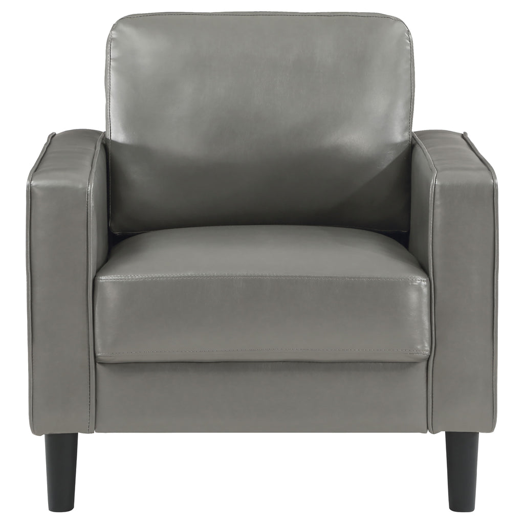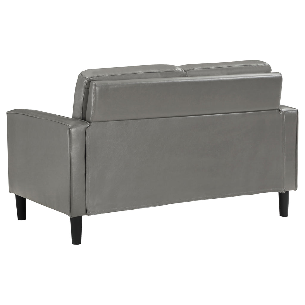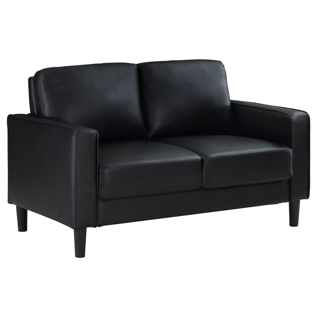 Create a stylish sense of cohesion in your living room with a modern two-piece sofa set. Infused with elegance, it features smooth faux leather upholstery over plush cushions, perfect for relaxing or entertaining. Both the sofa and loveseat feature a structured silhouette, complete with track arms and tapering legs that add a hint of height. Cushions are attached for a smooth, seamless look every day, with sinuous spring decking under seats and webbing across the back for excellent support. Neutral color sets the tone you're looking for, perfect in a curated living space. Key Features: • Matching sofa and loveseat set designed for a cohesive living room look • Black faux leather upholstery enhances the space with a sleek, modern feel • Plush foam cushions provide excellent comfort and long-term support • Slim track arms and clean lines create a contemporary, polished aesthetic • Tapered wooden legs add durability, stability, and mid-century appeal • Sturdy frame construction ensures reliable use for everyday lounging
