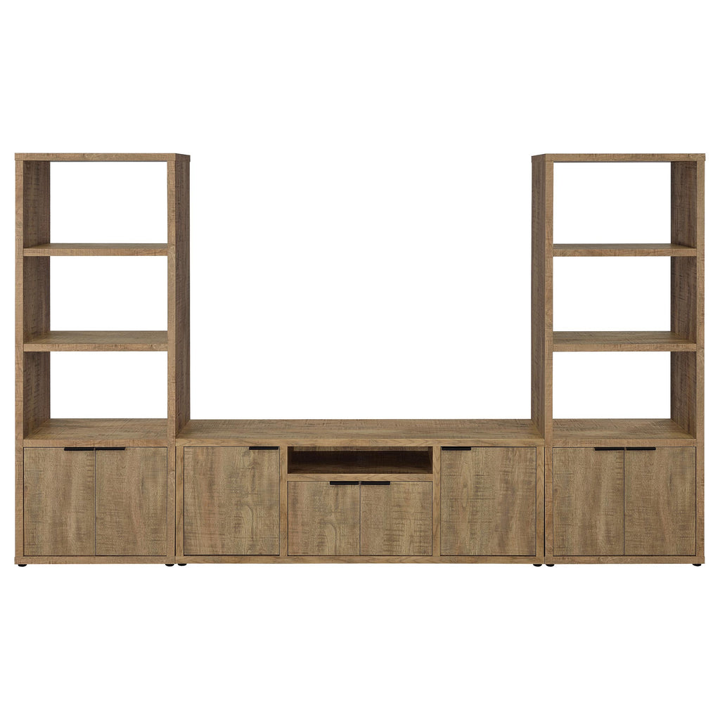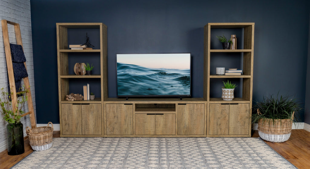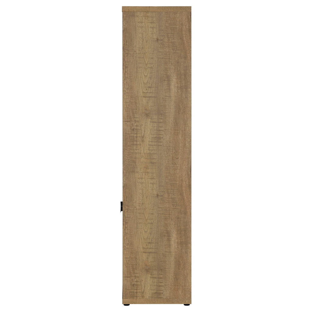The best of both worlds, a charming media tower bookcase adds both open display space and hidden storage in your inviting living room. Featuring a melamine paper finish that resembles mango wood, complete with roughhewn saw marks for a realistic, textured presentation, the tower is a perfect choice alone or flanking the matching TV stand. Three upper shelves provide a place for photos and art and glasswork, or can be used to display favorite media. Underneath, a two-door cabinet reveals additional shelving for easy organization of accessories and other odds and ends you'd prefer tucked out of sight. Sleek black pull handles are a perfect finishing touch. Key Features: • Charming media tower bookcase adds open display and hidden storage • Melamine paper finish resembles mango wood with roughhewn saw marks • Three upper shelves for photos, art, and glasswork • Two-door cabinet with additional shelving for accessories and odds and ends • Sleek black pull handles for a perfect finishing touch