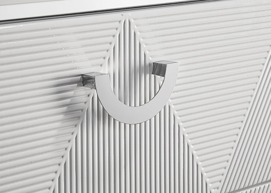 With a sleek high gloss finish and sculptural texture, this five-drawer chest makes a striking addition to the modern bedroom. Its geometric drawer fronts feature ribbed V-patterns that shift across each tier, accented by polished chrome U-shaped pulls. The top drawer is lined in black felt for delicate storage, while all drawers operate smoothly on 45mm metal extension glides. Elevated on tapered chrome-finished legs, this chest offers elevated storage with sharp visual impact. Key Features: • Five-drawer chest in white high gloss finish with sculptural ribbed geometric drawer fronts • Top drawer is fully lined in black felt to protect jewelry and delicate items • 45mm metal extension drawer glides ensure smooth and consistent drawer performance • Polished chrome U-shaped pulls add sleek contrast to textured sculptural surfaces • Tall vertical form provides generous storage in a modern, compact footprint • Crafted from engineered wood for style, structure, and longevity