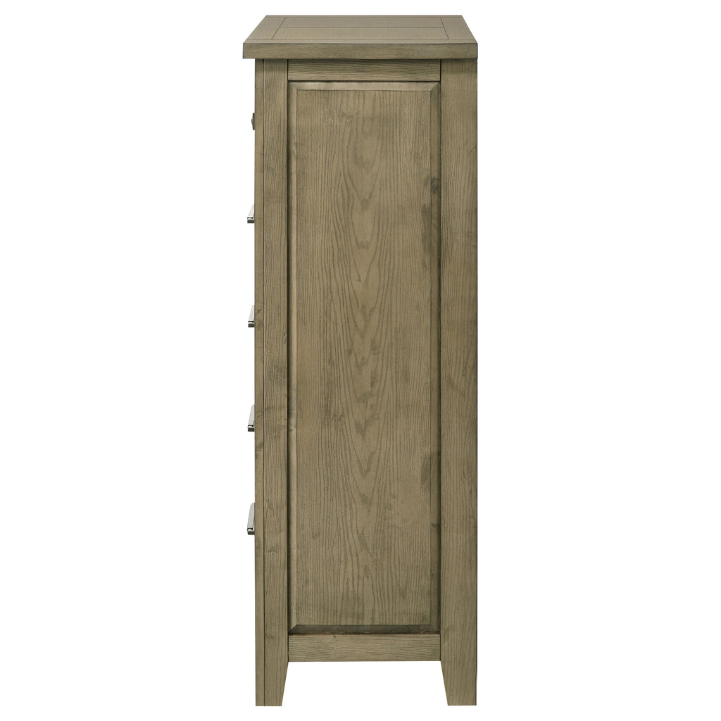 Designed with a relaxed sensibility, this five-drawer chest of drawers blends classic structure with subtle rustic appeal. Its vineyard oak finish highlights the oak grain embossing across solid rubberwood and engineered veneer surfaces. Antique nickel metal knob and pull handles add a touch of industrial charm, while heavy-duty metal ball bearing extension slides ensure smooth, dependable drawer operation. A balanced blend of softness and strength for modern bedroom storage. Key Features: • Five-drawer chest of drawers with clean lines and softly textured oak grain finish • Crafted from solid rubberwood with engineered wood veneer for durability • Vineyard oak finish enhances the natural depth of embossed wood grain • Antique nickel hardware includes a mix of metal knob and pull handles for added contrast • Heavy-duty metal ball bearing extension slides ensure smooth and reliable drawer movement • Fully assembled and includes tip-over restraint for enhanced safety