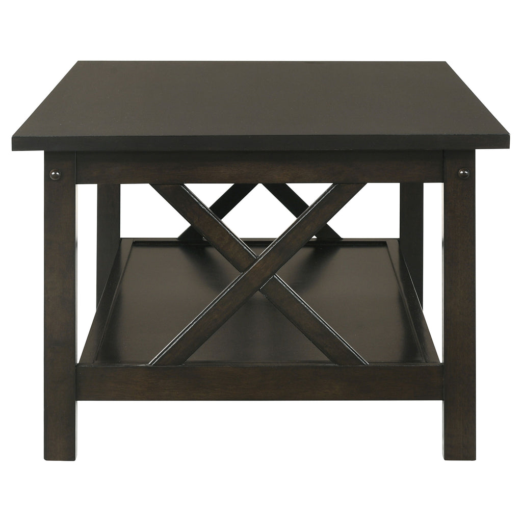 This 3-piece occasional table set includes a coffee table and two end tables, ideal for a living room or lounge. Constructed from hardwood, engineered wood, and rubberwood veneer, this set showcases a rich dark merlot finish. Each piece is designed with a lower shelf for extra storage space, while the X-shaped accents on the sides add a touch of visual appeal. This coffee table set is a perfect combination of form and function for your home. Key Features: • Three-piece coffee table set featuring a stylish coffee table and two end tables • Dark merlot finish complements any living room decor • Lower shelf provides additional storage and display space • X-shaped side accents enhance the table's overall design • Crafted from hardwood, engineered wood, and rubberwood veneer • Strong and durable construction ensures long-lasting use
