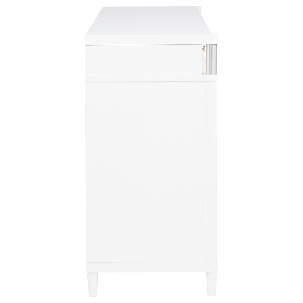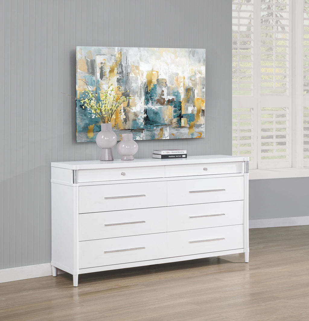 This eight-drawer dresser exudes modern sophistication through a sleek silhouette and softened edges. Elongated brushed nickel pulls and vertical tube accents create visual interest while enhancing the dresser’s clean structure. Built from solid rubberwood, engineered wood, and finished with a smooth laminate veneer, it offers ample storage and felt-lined top drawers. Designed for refined function in any contemporary bedroom. Key Features: • Eight-drawer dresser with softened corners and a clean-lined, modern silhouette • White finish contrasts with brushed nickel pulls and vertical metal tube accents • Felt-lined top drawers with tinted interiors provide secure, organized storage • Drawers feature dovetail joints and glide smoothly on heavy-duty metal glides • Made from solid rubberwood, engineered wood, and smooth laminate veneer • Fully assembled dresser includes integrated tip-over restraint for added safety