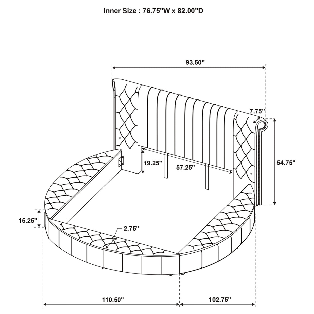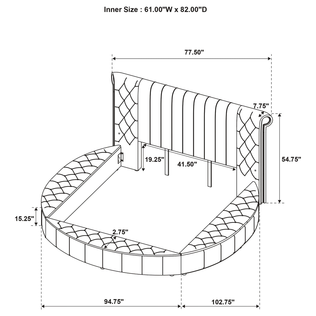 Embrace the art of retreat with a bedroom set that transforms luxury into an experience. Anchored by a grand round bed wrapped in plush velvet, the design features a sculpted scroll headboard with deep tufting and vertical channeling. Built-in USB-A and USB-C ports on both sides blend convenience into the romance, while hidden compartments beneath the upholstered base offer clever storage. Coordinating pieces mirror the softness and sparkle, with crystal hardware and sleek glass-topped silhouettes that complete the scene with quiet opulence. Key Features: • Round bed features a fully upholstered frame with hidden storage beneath lift-up panels • Scroll-back headboard includes vertical channeling and deep tufting in soft velvet fabric • Dual USB charging ports with USB-A and USB-C access are built into both sides of the bed • Coordinating case pieces feature velvet upholstery with vertical stitching and crystal accents • Glass-topped surfaces offer durability while enhancing the visual elegance of each piece • Constructed from solid rubberwood, engineered wood, velvet, foam, and mirrored materials