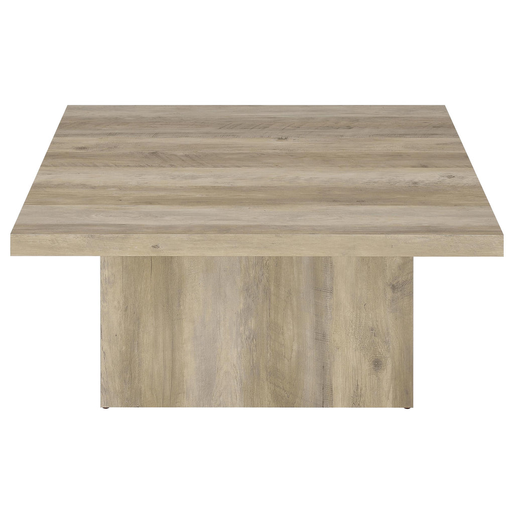Natural ambiance brings a fresh motif to your casual spaces in the form of a square wood coffee table with the power to change up a design scheme. The square coffee table reflects a heady natural vibe with wood grain markings on natural mango finish wood products construction. Its spacious overhang top and oversized block base create delightful optical effects with a low-key feel. Centered in a casual yet elegant room, it speaks to your signature organic design statement. Experiment with suitable ensemble pieces to make the rustic look of this cocktail table a main factor. Key Features: • Square coffee table made from engineered wood with laminate veneer for durability • Features a natural mango wood look with visible grain markings for rustic charm • Spacious overhang top provides plenty of room for display and functionality • Oversized block base adds to the table's sturdy and balanced design • Eco-friendly laminate veneer offers a scratch-resistant surface for longevity • Ideal for casual, rustic interiors seeking a natural and understated aesthetic