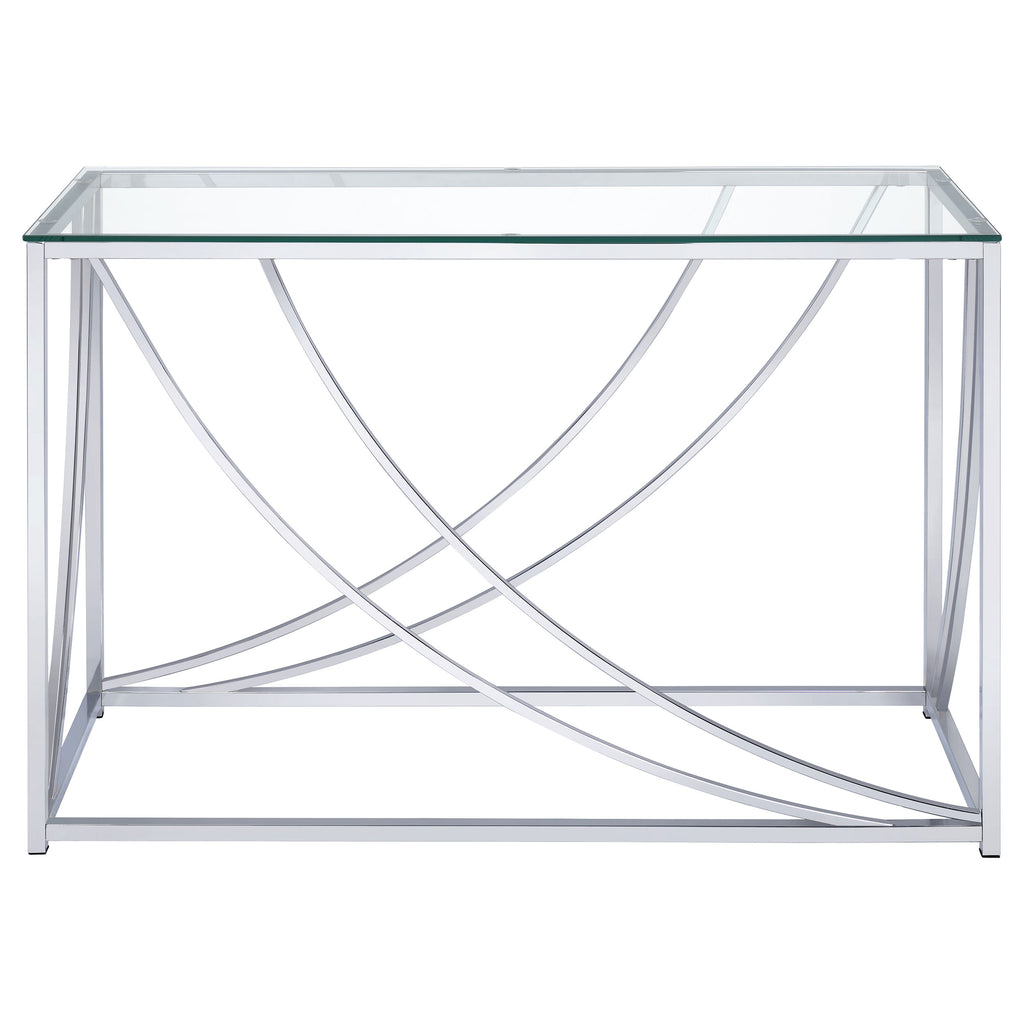 This rectangular console table combines modern elegance with practical design. Featuring a clear tempered glass top, it offers both durability and style. The electroplated chrome frame adds a sleek, polished finish, while gracefully curved metal accents enhance its sophisticated look. Ideal for placement in hallways, entryways, or behind a sofa, this table blends function with form, providing a stylish surface for display or storage in various living spaces. Key Features: • Rectangular console table with a clear tempered glass top • Electroplated polished chrome frame with a sleek reflective finish • Gracefully curved metal accents add modern sophistication • Durable metal construction ensures long-lasting stability and use • Versatile design perfect for hallways, entryways, or behind a sofa • Sleek, minimalist structure complements contemporary interiors