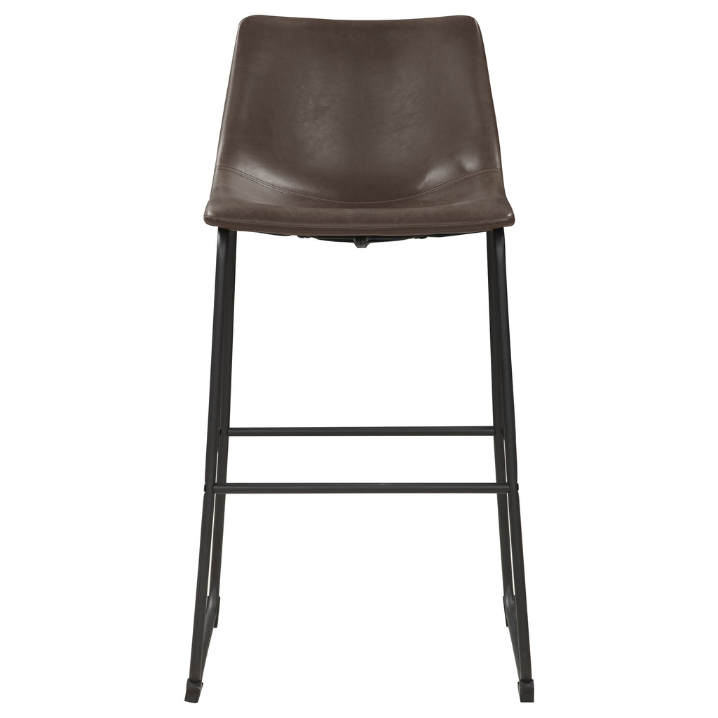 This cozy, casual stool will have you dining in style. With a supportive back and foot pedestal, it offers a comfortable place to enjoy a meal or a cocktail. Its seat is upholstered in beautiful, two-tone brown leatherette. Its base is constructed from high-quality metal in a striking black finish. With a sleek silhouette and a classic design, this stool looks fabulous in any dining area. Key Features: • Enhance your pub seating with these armless bar stools in a captivating two-tone brown and black combination, adding an industrial touch to your space • Elevate your dining style with these casual stools featuring a supportive back and foot pedestal, offering comfortable seating for meals and cocktails • The seat's beautiful brown leatherette upholstery adds a touch of sophistication, enhancing the stool's aesthetic appeal • Built with high-quality metal in a sleek black finish, the stool's base not only provides stability but also contributes to its eye-catching design • With a sleek silhouette and classic design, these stools effortlessly enhance the ambiance of any dining area, combining functionality with a touch of fabulousness
