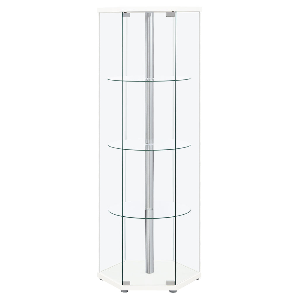 This curio cabinet reimagines display storage with a striking hexagonal silhouette. Its geometric shape adds visual depth while clear tempered glass panels showcase treasured items from all angles. Three round glass shelves offer generous space for décor, collectibles, or keepsakes, supported by a sleek center pole with chrome accents. With a magnetic push-to-open door and sturdy construction of glass, engineered wood, and laminate veneer, this piece is a stylish way to highlight what matters most. Key Features: • Hexagonal curio cabinet in black with sleek chrome accents and center pole • Magnetic push-to-open clear tempered glass door provides easy access • Three round tempered glass shelves for collectibles and decorative items • Clear tempered glass panels highlight displays from multiple viewpoints • Constructed with glass, engineered wood, laminate veneer, and metal • Geometric design creates a striking modern presentation for display pieces
