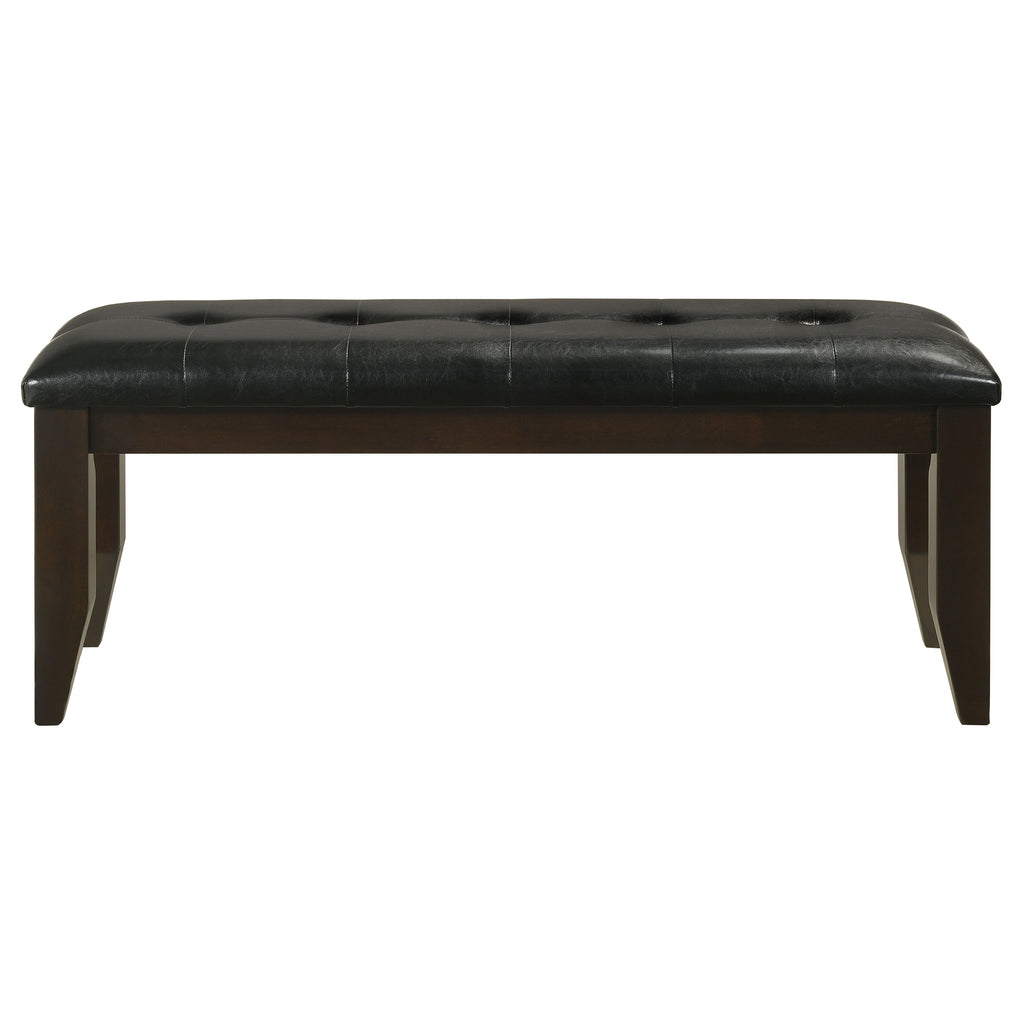 A versatile addition to any dining space, this dining bench offers both stylish seating and space-saving functionality. The solid rubberwood frame provides lasting durability, while the padded seat ensures comfort. A button-tufted design adds a sophisticated touch, while the sturdy legs provide reliable support. Designed for casual and formal dining spaces alike, this bench is perfect for families, guests, or everyday use, and easily tucks under the table when not in use. Key Features: • Stylish dining bench offers space-efficient seating for any dining room • Warm cappuccino finish enhances its classic and versatile aesthetic • Padded seat upholstered in black faux leather for a refined, modern feel • Solid rubberwood construction ensures strength and durability for daily use • Button-tufted detailing adds a sophisticated and elegant touch to the seat • Compact design allows for easy storage beneath the table when not in use