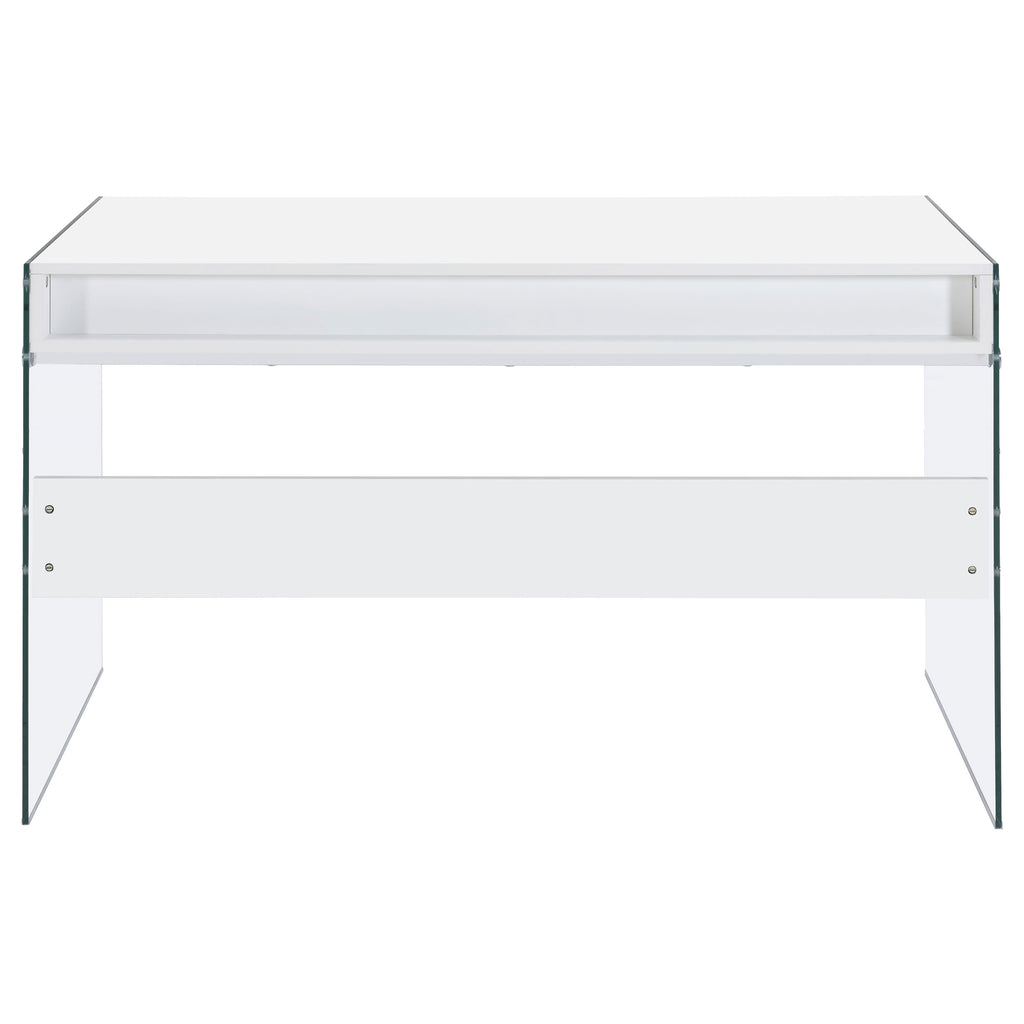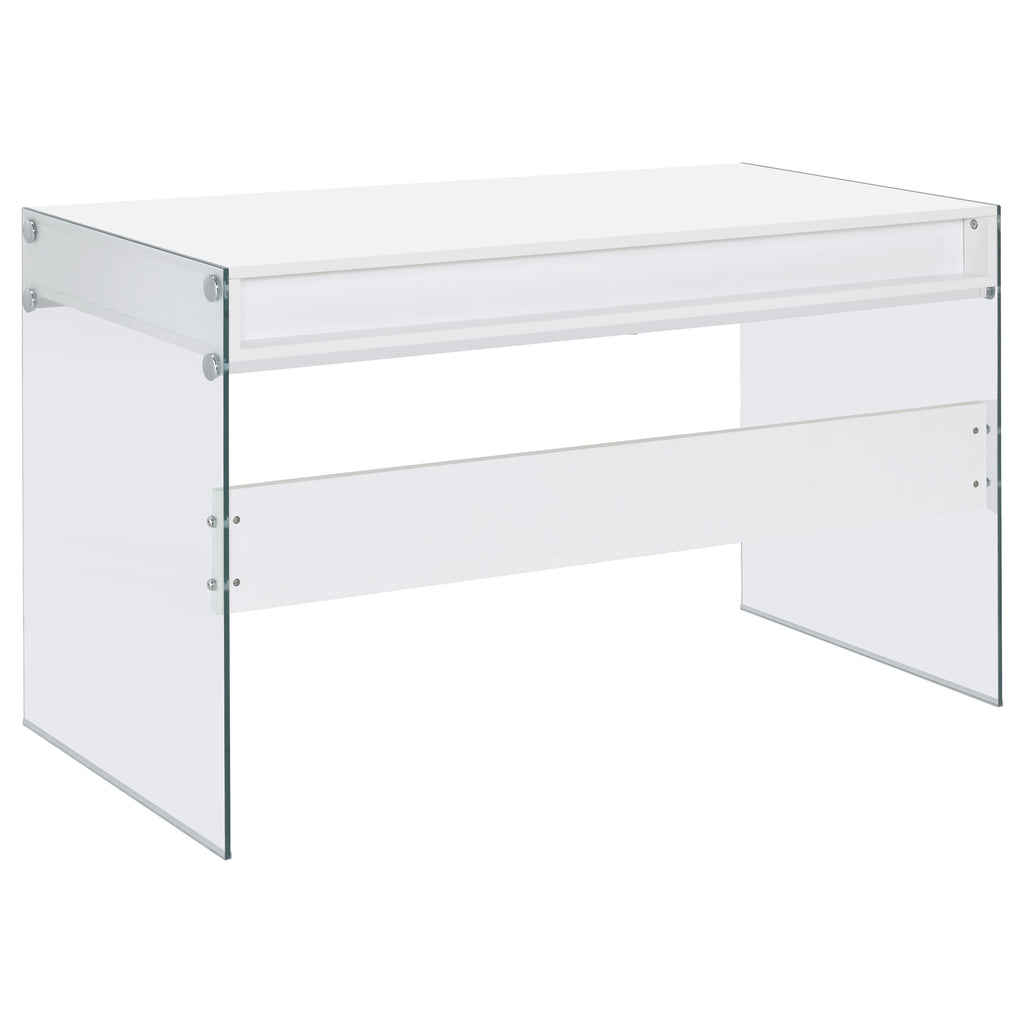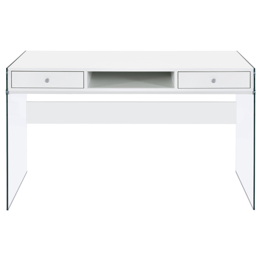 With its cool, contemporary appeal, this versatile writing desk works well in a bedroom or living room. It creates a functional space to work and study without sacrificing style. Bold, thick, tempered glass panels form its base supports, giving it an inspired touch of glamour. Its striking aesthetic is brought to life with a finish of glossy white. This desk is complete with an open center compartment and two drawers, adding extra convenience while maintaining its sleek look. Key Features: • Contemporary writing desk with clear glass side panels and white top • Two drawers and one center cubby provide storage and function • High gloss engineered wood top adds a polished modern appearance • Tempered glass legs give the desk a floating visual effect • Sleek chrome-finished knobs complement the clean white design • Ideal for minimalist bedrooms, living rooms, or compact offices