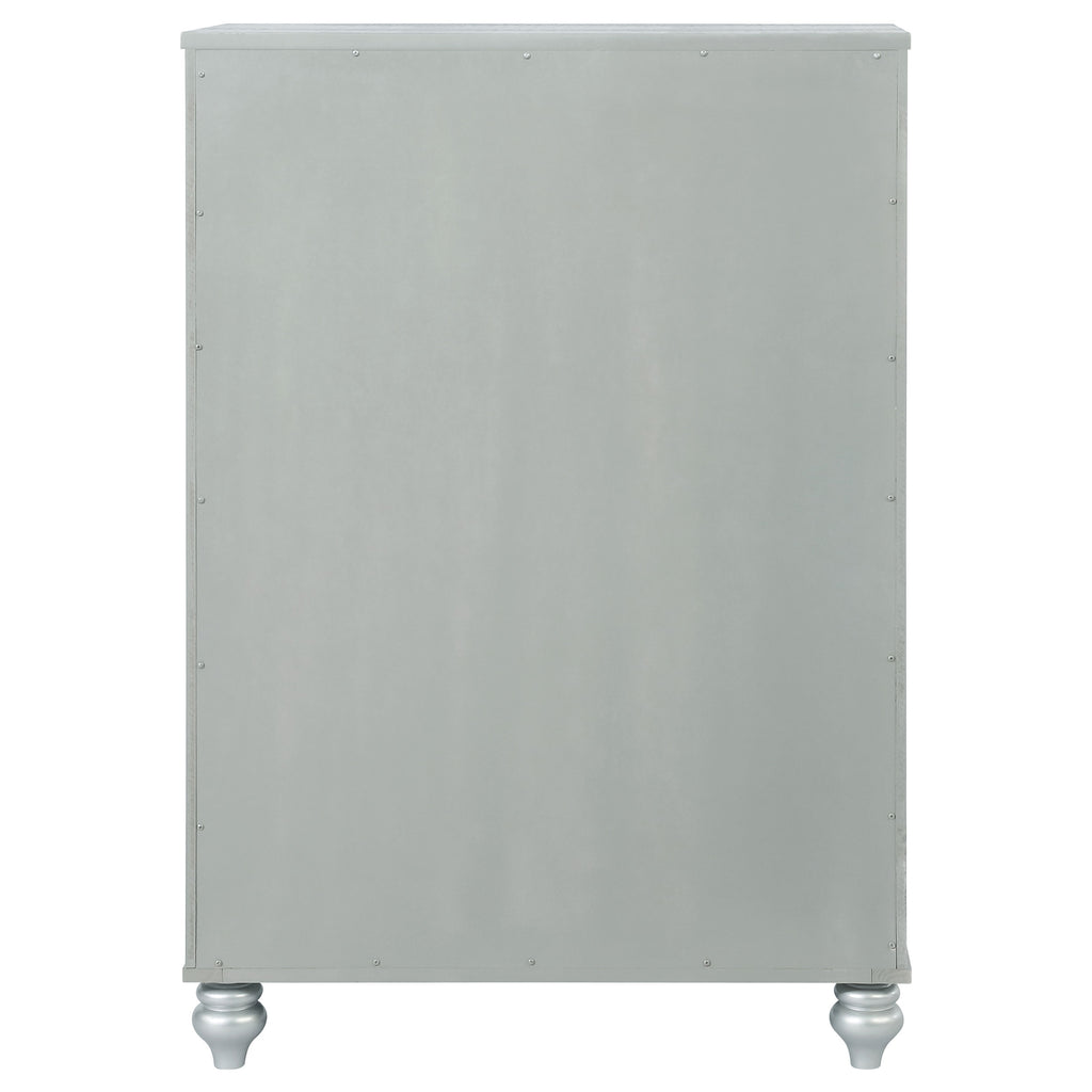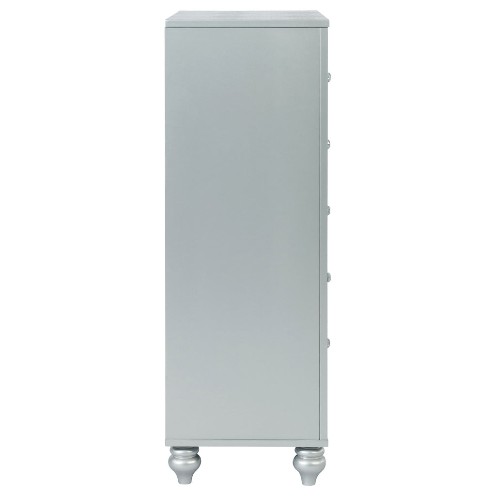 Enhance your home with a modern glam update to a classic design with this transitional five-drawer chest. It boasts a dazzling design that takes lends glitz to any modern bedroom. It comes in a vibrant silver metallic finish with fret work detail on the front panels and drawer fronts. The drawers are adorned with crystal-like pulls and the top ones are lined with black felt to protect treasured valuables. Delicate bun feet complete the design of this exquisite masterpiece. Key Features: • Five-drawer chest with vertical layout and glamorous silver finish • Mirrored trim frames each side and highlights the fretwork drawer fronts • Crystal-like drawer knobs add sparkle and coordinate with matching pieces • Top drawer includes felt lining for storing small valuables or accessories • Classic bun feet anchor the design with a soft traditional touch • Built from engineered wood, polyresin detailing, and mirrored veneer