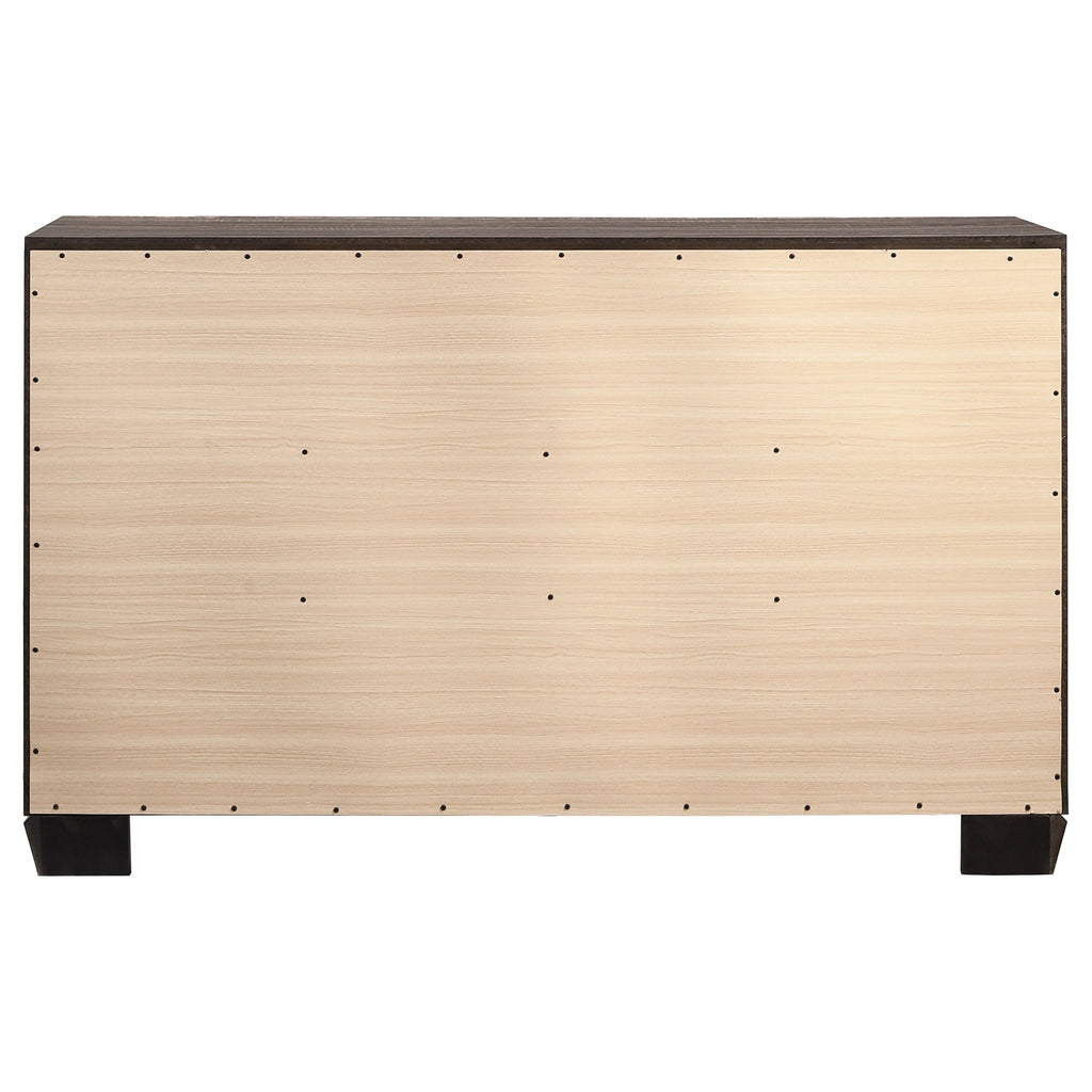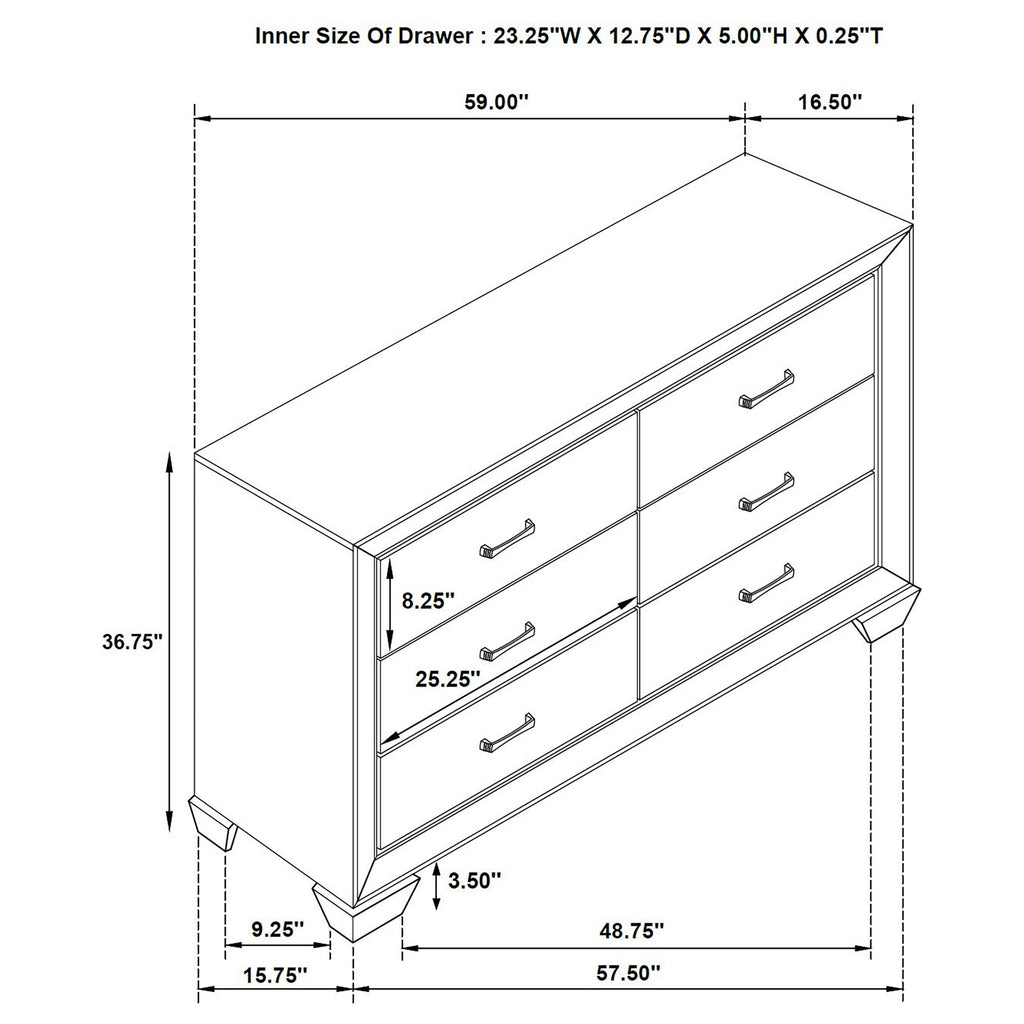 Stylish and light, the soft hues from this six-drawer dresser highlight clean lines. Featuring a stunning exposed wood grain, the washed taupe finish radiates sophistication. Mid-century modern-inspired, delicately tapered legs combine with metallic drawer pulls to create a refined sense of style. Smooth and sleek drawer fronts and sides marry to put the focus on the variations in the natural oak. Black recessed grooves around picture framed case drawer fronts adds contrast. Key Features: • Six-drawer dresser with angular casing and tapered block-style feet • Washed taupe finish showcases weathered oak grain with a light neutral tone • Black recessed grooves outline drawer fronts for a crisp contrasting detail • Chrome bar pulls add a contemporary metallic touch to the rustic frame • Spacious drawer layout provides practical bedroom organization • Built from engineered wood and wrapped in a scratch-resistant veneer finish