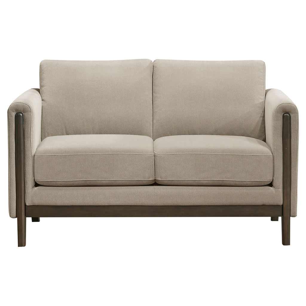 Rooted in clean architectural lines, this upholstered sofa set blends modern structure with plush comfort. Each piece is framed in engineered wood with a warm coffee finish and features recessed panel arms that lend sculptural definition. Upholstered in soft taupe polyester, the seat and back cushions are fully reversible, offering extended usability and lasting support. Designed to bring balanced form and function to contemporary living spaces. Key Features: • Sofa set features clean lines and recessed panel arms for a structured, modern silhouette • Framed in engineered wood with a rich coffee finish for warm contrast and durability • Taupe polyester upholstery offers a soft texture with easy-care functionality • Reversible seat and back cushions provide flexibility and long-term comfort • Low-profile design balances tailored form with a relaxed, welcoming feel • Coordinates seamlessly for a cohesive and versatile living room arrangement