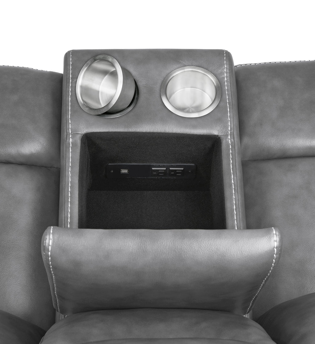 Experience superior comfort and modern convenience with this glider reclining loveseat upholstered in smooth grey faux leather. Designed with plush padded seats, headrests, and armrests, it offers a relaxing and supportive feel. The centre console includes two stainless steel cup holders, a soft-close lift-top compartment with dual AC and USB ports, and a lower storage drawer for added functionality. With a one-inch cool gel memory foam topper, this loveseat delivers lasting comfort and effortless style._x005F_x000D_ Key Features: • Manual glider reclining loveseat blends comfort and functionality • Smooth grey faux leather upholstery enhances modern appeal • Centre console includes dual stainless steel cup holders • Soft-close lift-top storage features two AC and two USB outlets • Hidden storage drawer keeps remotes and accessories organised • Cool gel memory foam topper ensures plush, lasting comfort