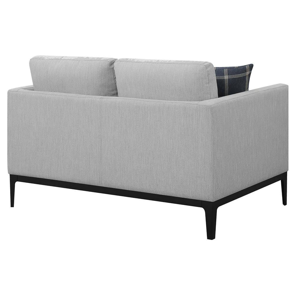 This loveseat is the ultimate in casual comfort. With a soft, plush back and seat cushions, it offers hours of soothing relaxation. Its lovely, muted shade of light grey blends effortlessly with a variety of color palettes. Two dark accent pillows with a pleasing plaid pattern provide a lovely contrast to its frame. This loveseat is a beautiful enhancement to any living room's decor. Key Features: • This collection features clean lines and modern track arms for a sleek look • Feather down wrapped cushions provide ultimate comfort • Back and seat cushions are fully reversible for easy cleaning and maintenance • Innovative metal base has been custom designed for this collection for easy leg assembly • Includes down-filled accent pillows in plaid and faux suede fabric