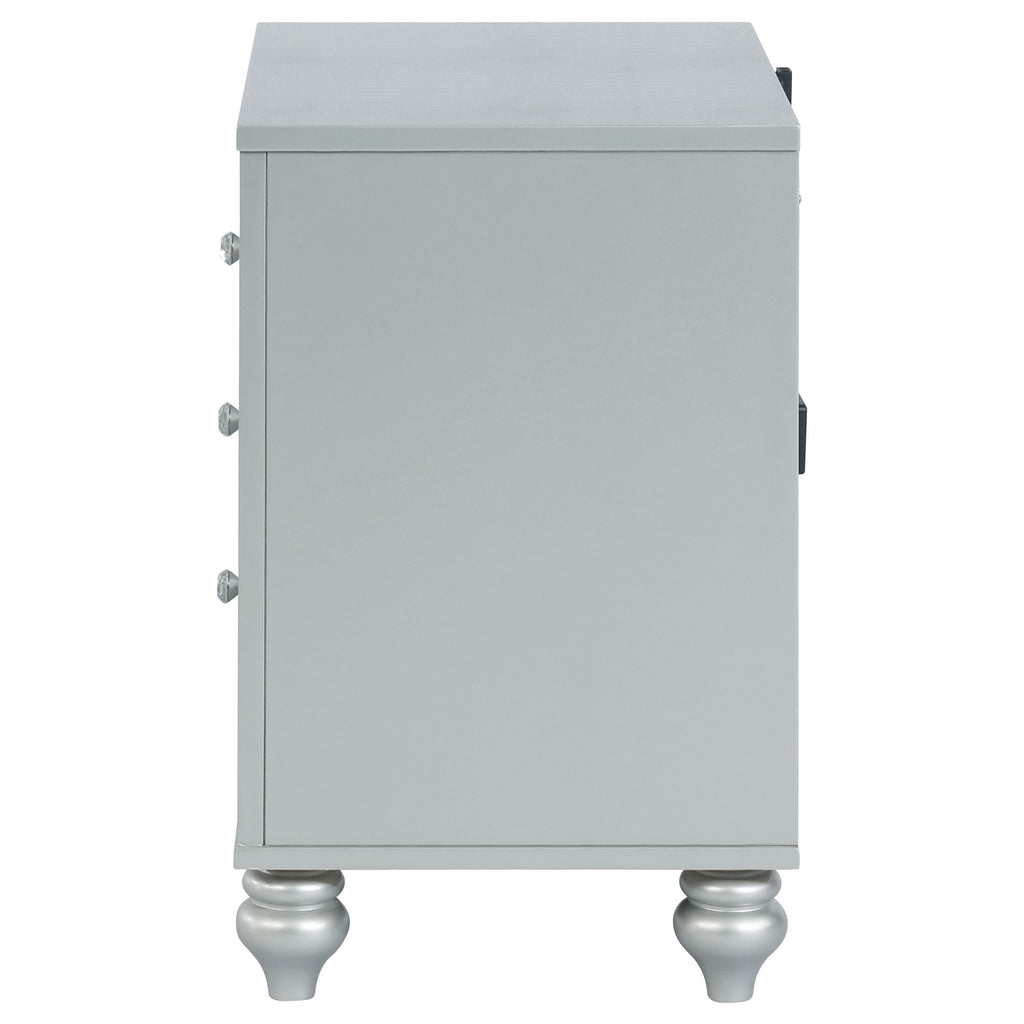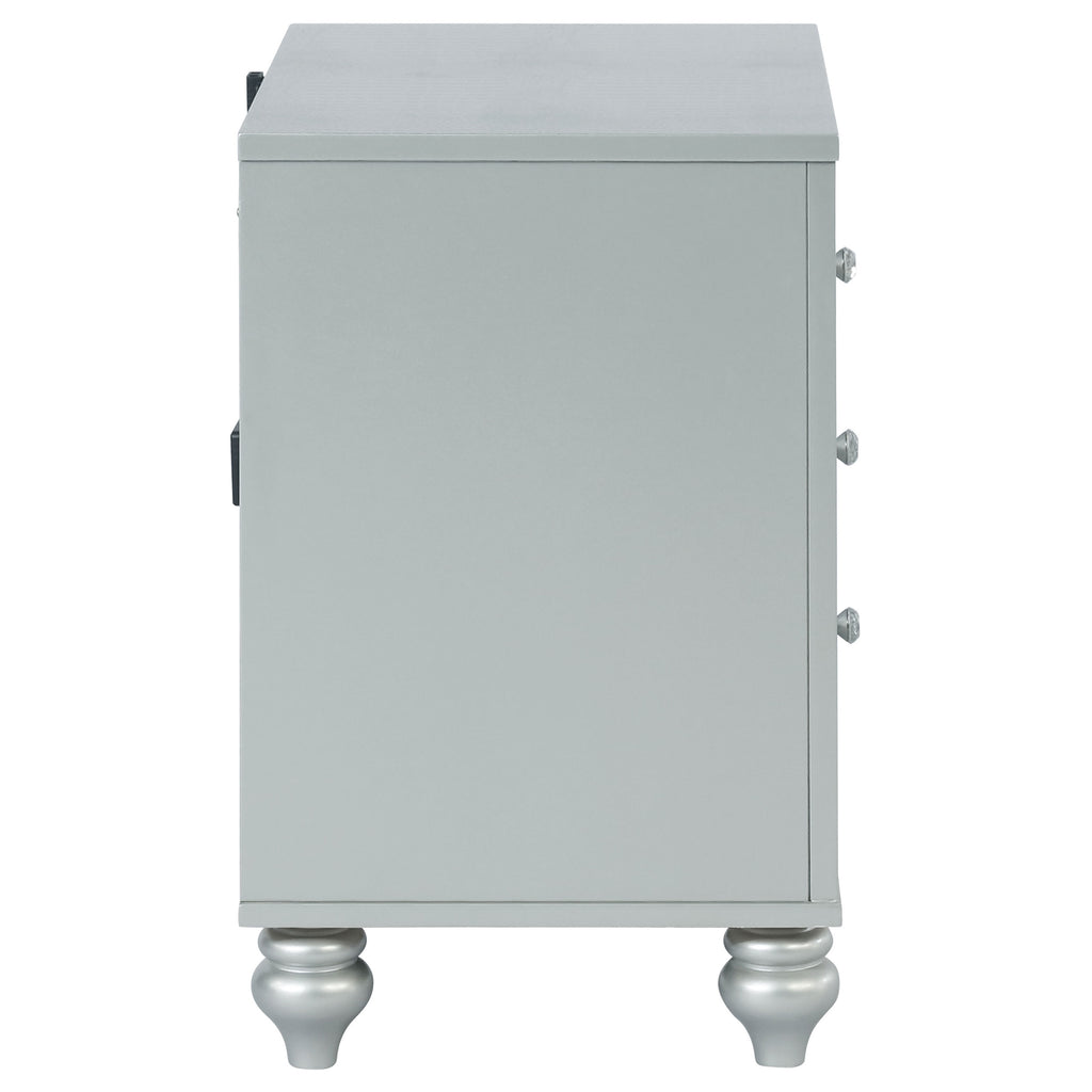 Bring modern glam to a classic design with this transitional two-drawer nightstand. It features a glitzy design that draws the eye in any modern home. It's crafted with a vibrant silver metallic finish with fret work detail on the front panels and drawer fronts. The drawers are adorned with crystal-like pulls and the top one is lined with black felt. Dual USB ports and delicate bun feet complete the design of this exquisite accent piece. Key Features: • Two-drawer nightstand with silver metallic finish and mirrored trim accents • Front panels feature fretwork detail with crystal-like knobs on each drawer • Top drawer is felt-lined and includes dual USB charging ports for convenience • Clear sealer drawer boxes glide smoothly for accessible bedside storage • Stands on delicately shaped bun feet to elevate the refined design • Constructed from engineered wood, mirrored accents, and polyresin trim