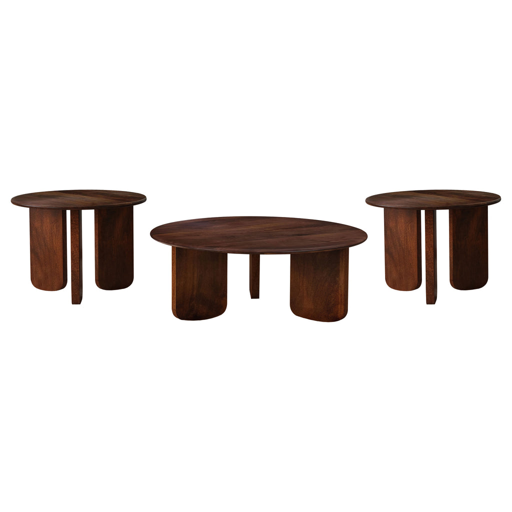 Enhance your living space with this modern coffee table set, featuring a round coffee table and a matching end table. Both pieces are crafted from solid mango wood with a rich brown finish that highlights the natural wood grain. The round tabletops with softly rounded edges offer a sleek yet inviting look, while the distinctive base designs bring depth and visual intrigue. Inwardly angled slab legs with rounded corners provide stability and an artistic touch, creating a cohesive and stylish occasional centerpiece for your home. Key Features: • Modern coffee table set crafted from solid mango wood for durability • Rich brown finish highlights the beauty of natural wood grain • Round tabletops with rounded edges for a soft and inviting design • Unique base designs with inwardly angled slab legs for visual appeal • Rounded leg corners add stability and enhance sculptural aesthetics • Ideal for creating a cohesive, stylish look in your living space