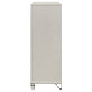 Discover elegance and functionality with this beautifully crafted chest, designed to complement your bedroom suite. The pearl white finish, highlighted by the unique diamond star drawer fronts and chrome metal pulls, exudes a contemporary charm. Acrylic feet with polished chrome caps add a touch of sophistication. Offering ample storage, this chest keeps your space organized while enhancing your room’s aesthetic. Experience the perfect blend of style and practicality with this exceptional piece.