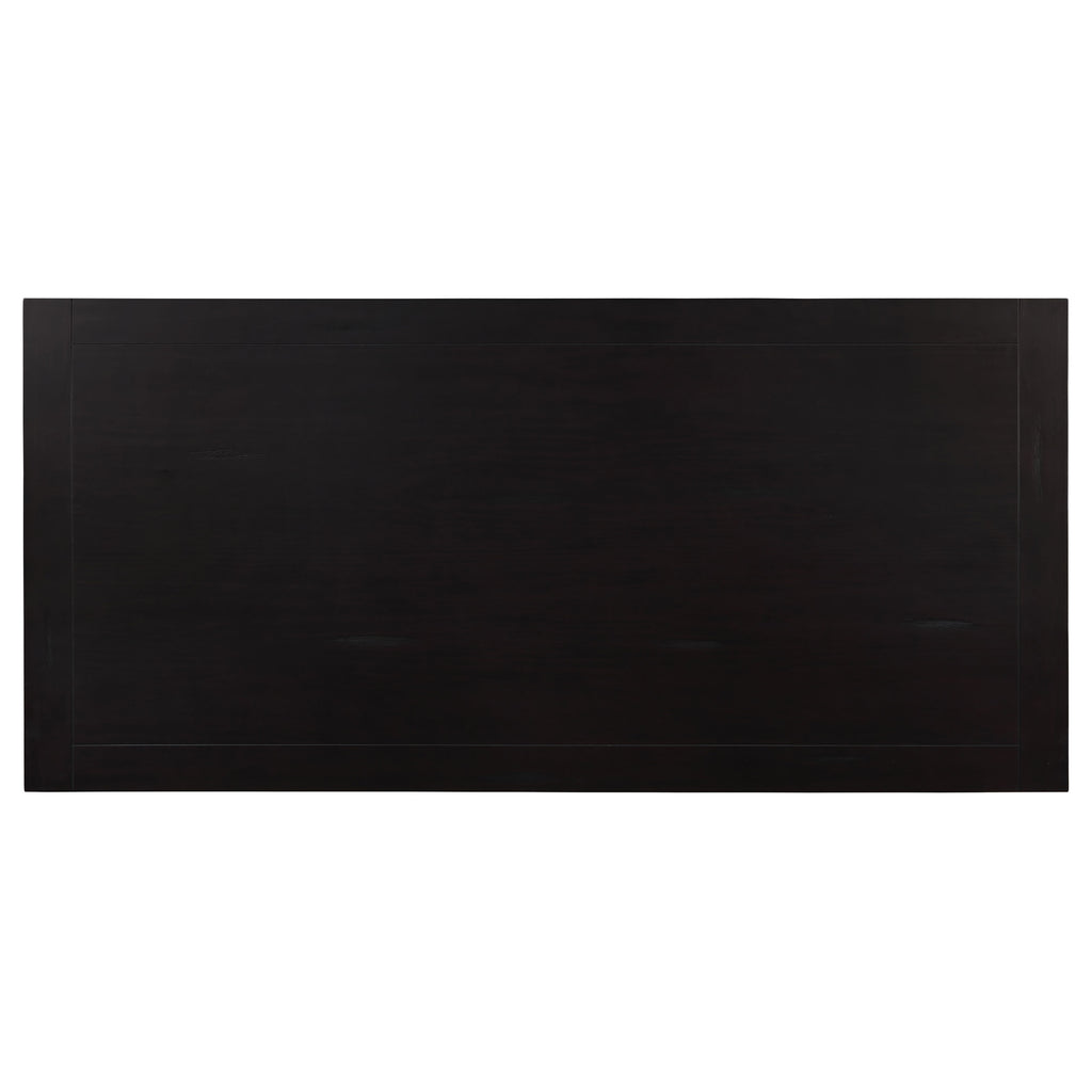 A home with a country design deserves a dining table with a rustic appeal. This dining table is constructed with a rectangular design that's long and wide. The stylishly curved table legs are connected with a trestle-like piece that adds durability. Table is ideal for big family gatherings with animated conversation. With a set of matching side chairs or armchairs, this table looks great in any formal dining setting. Key Features: • Rustic espresso finish enhances traditional charm and rich woodgrain tones • Eighty-six inch top accommodates large gatherings and formal dining • Wide rectangular surface offers generous space for serving and place settings • Crafted from pine, polyresin, engineered wood, and laminate veneer • Supports up to three hundred pounds and requires assembly upon delivery