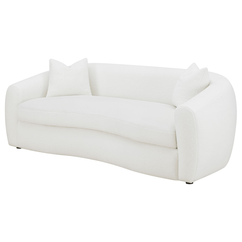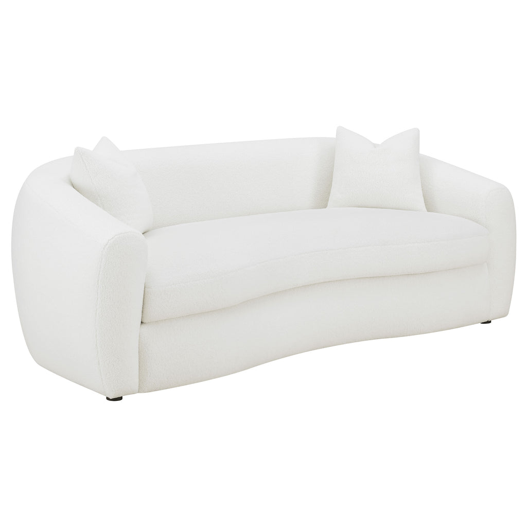 Create your inviting living room with this contemporary natural sofa, upholstered in boucle upholstery throughout its gracefully designed, contoured silhouette and elegantly sloped armrests. Matching accent pillows with premium faux down fill offer extra coziness and comfort to the curved bench cushion and tailored backrest.