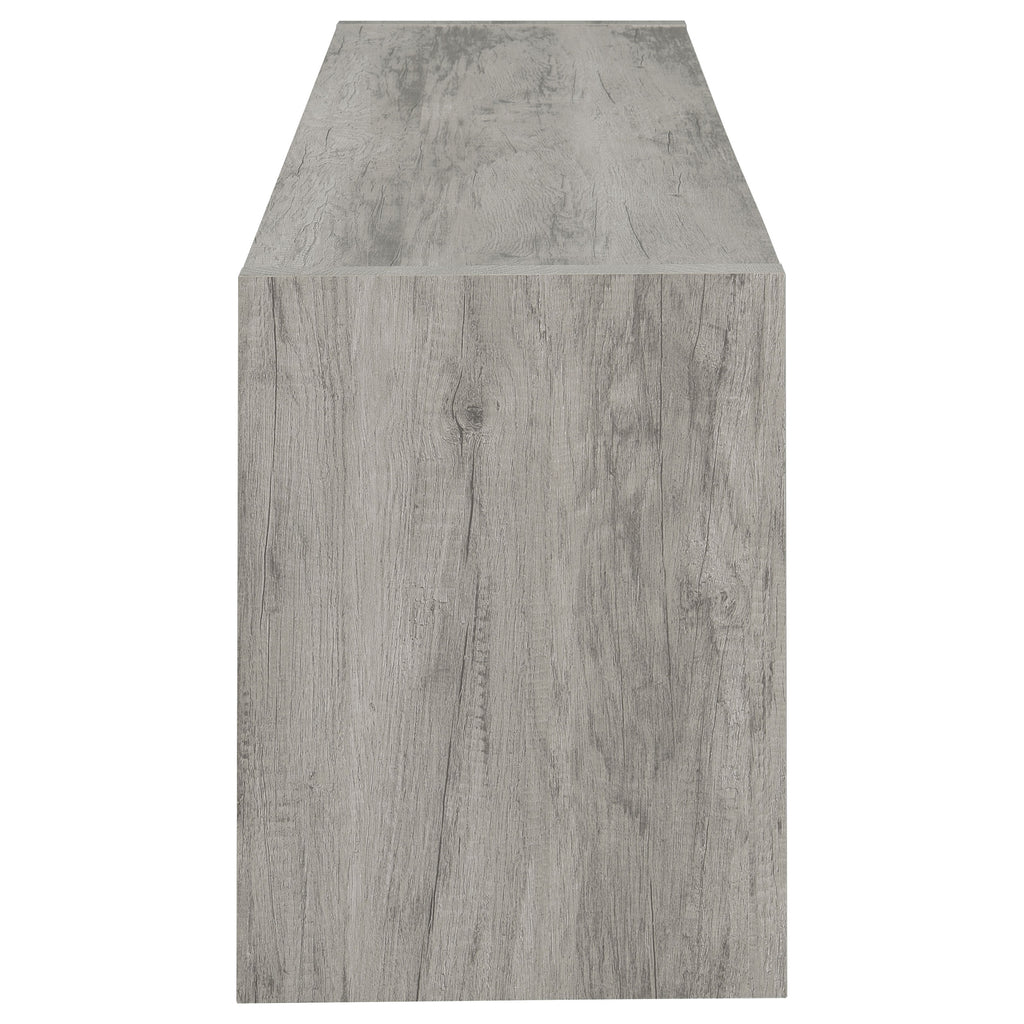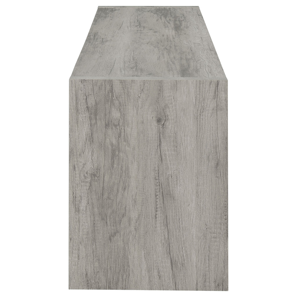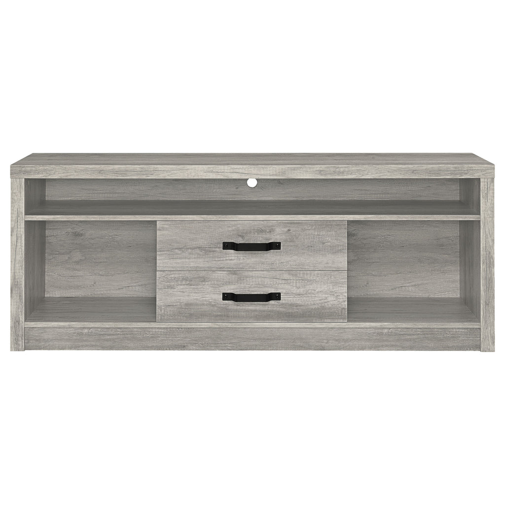 Elevate your living space with this sleek 59-inch TV stand that combines clean lines and versatile storage. A modern grey driftwood finish adds a light, airy feel to any entertainment area. Designed to accommodate TVs up to 65 inches, it features a wide top shelf, two open side compartments, and dual drawers with black hardware for contrast. Perfect for organizing devices, décor, and accessories, this stand is crafted from engineered wood with a durable laminate veneer for lasting style. Key Features: • 59-inch TV stand accommodates TVs up to 65 inches • Grey driftwood finish adds brightness and contemporary appeal • Two drawers with black hardware provide enclosed media storage • Open shelving offers easy access for devices and display décor • Engineered wood with laminate veneer ensures lasting durability • Perfect centerpiece for transitional or modern entertainment areas