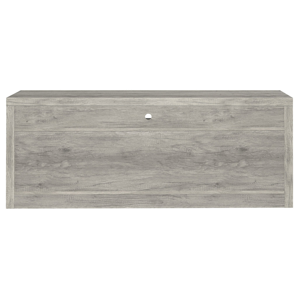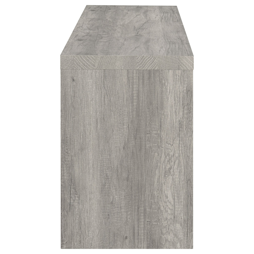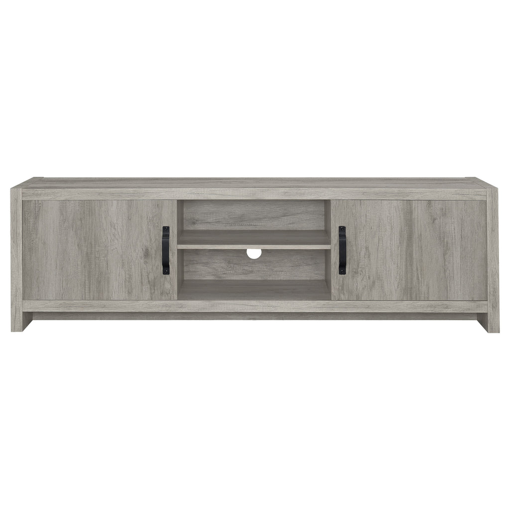 Elevate your living space with this sleek 59-inch TV stand that combines clean lines and versatile storage. A modern grey driftwood finish adds a light, airy feel to any entertainment area. Designed to accommodate TVs up to 65 inches, it features a wide top shelf, two open side compartments, and dual drawers with black hardware for contrast. Perfect for organizing devices, décor, and accessories, this stand is crafted from engineered wood with a durable laminate veneer for lasting style. Key Features: • 59-inch TV stand accommodates TVs up to 65 inches • Grey driftwood finish adds brightness and contemporary appeal • Two drawers with black hardware provide enclosed media storage • Open shelving offers easy access for devices and display décor • Engineered wood with laminate veneer ensures lasting durability • Perfect centerpiece for transitional or modern entertainment areas