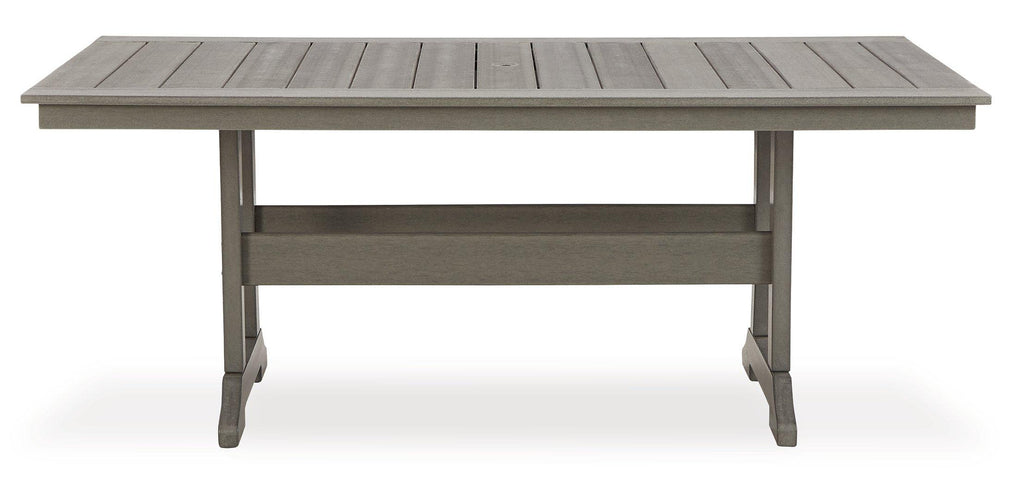 It’s the dawn of a new day for gray. Embrace the style trend with this outdoor dining set. Each piece is crafted of HDPE material, combining the exceptional durability and weather resistance you need with the ‚Äúwood look‚Äù you love. The rectangular table and comfortably cushioned chairs take alfresco living to a whole new level. A slatted table top infuses a plank-style, farmhouse-inspired touch and naturally sheds rainwater. Rest assured, the thick seat and back cushions on the chair are wrapped in Nuvella® high-performance fabric that’s fade-resistant, stain-resistant and a breeze to clean.