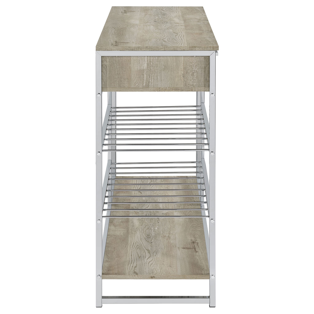 Your entertaining needs are filled with a sense of casual style and supreme organization as this wine cabinet provides space and configuration for a casual space. Make serving a breeze with a cabinet featuring gray finish wood products construction of an upper two-drawer cabinet and matching lower shelf. Minimalist metal framing adds a great optical benefit, with two slat shelves that accommodate dishware and stemware. Drawers open easily to make space for implements. This all-in-one bar cabinet offers a fresh, clean look and lots of convenience to organize an entertainment regimen. Key Features: • Gray finish wood products construction with minimalist metal framing for an all-in-one wine cabinet with two drawers and two slat shelves • Drawers open easily to make space for implements, while shelves accommodate dishware and stemware • Upper two-drawer cabinet and matching lower shelf provide space and configuration for a casual space • Fresh, clean look and lots of convenience to organize an entertainment regimen • Casual style and supreme organization for your entertaining needs